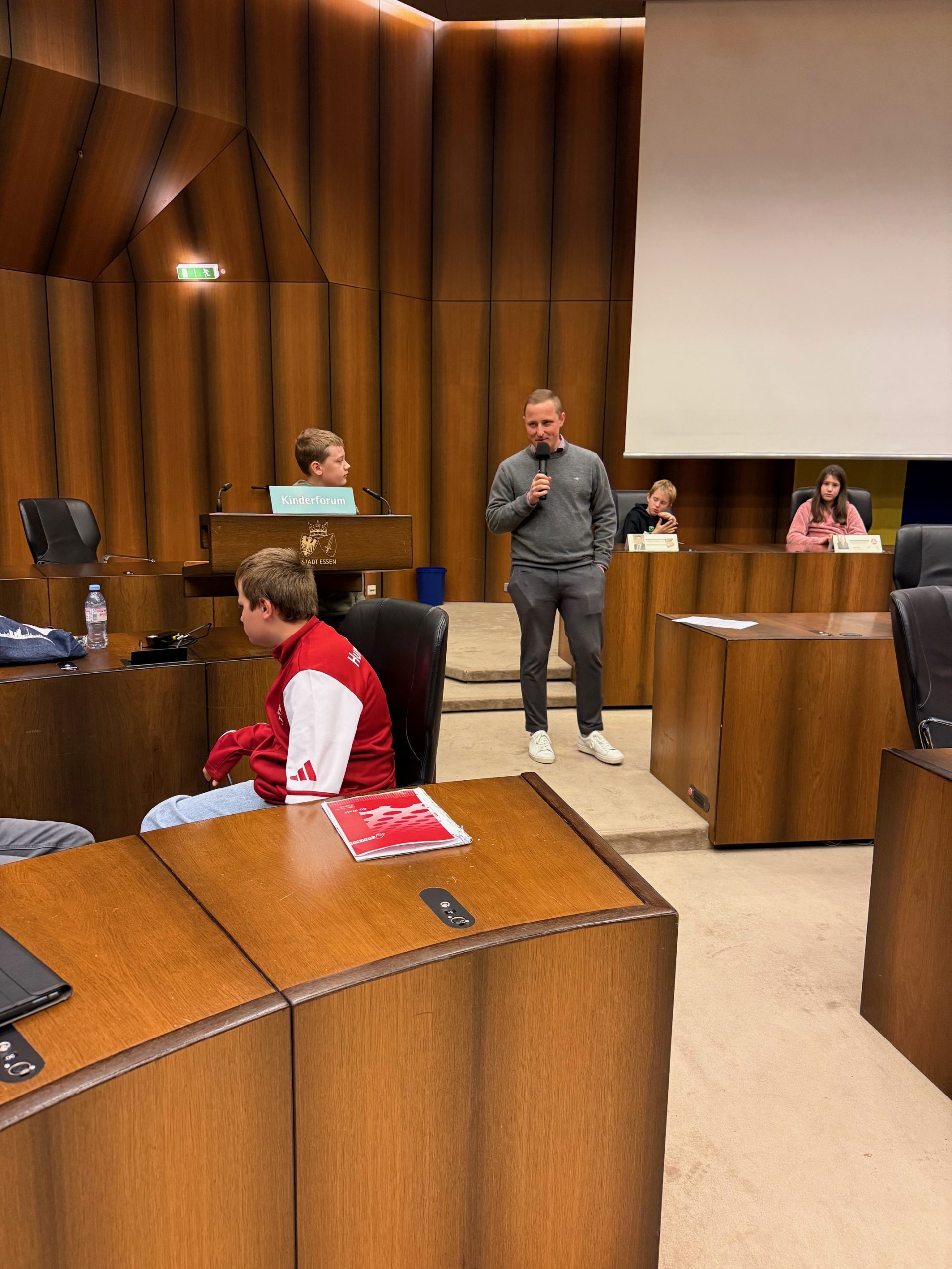 Im Anschluss durfte die 6e selbst aktiv werden: In einer simulierten Ratssitzung wurden alle Rollen vollständig besetzt: vom Oberbürgermeister über die verschiedenen Dezernentinnen und Dezernenten bis hin zu Ratsfrauen und Ratsherren. Die Kinder diskutierten eigene Anliegen und brachten konkrete Verbesserungsvorschläge ein. Besonders wichtig waren ihnen die Themen Sport, Tierschutz, Verkehrssicherheit sowie der Wunsch nach digitalen Schulbüchern. Zu diesem letzten Punkt überreichte die Klasse sogar eine selbst erstellte Unterschriftenliste an Herrn Ducree.