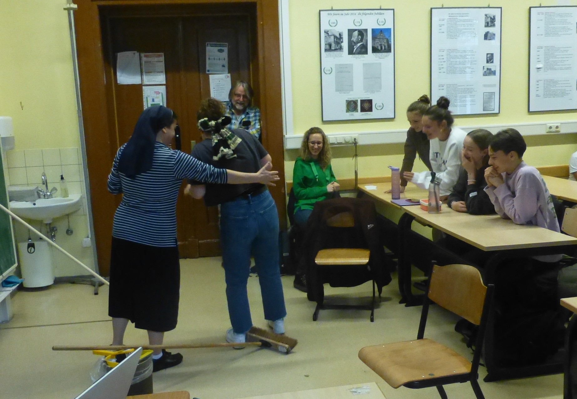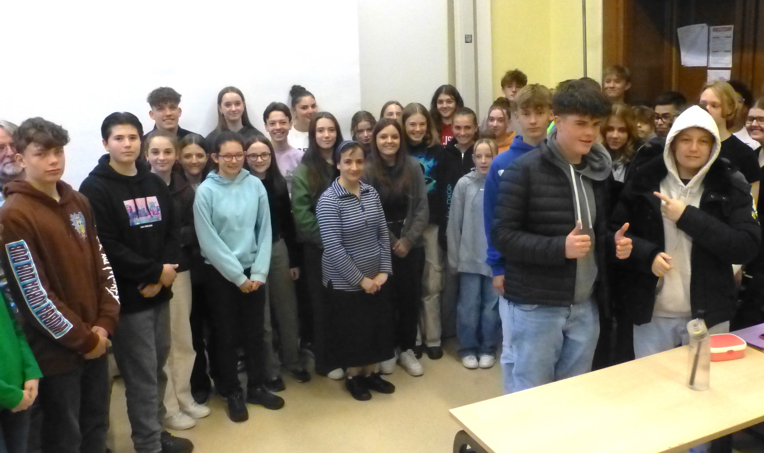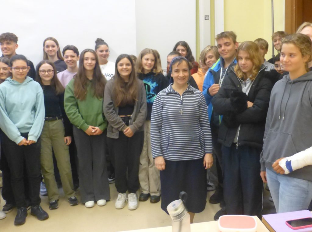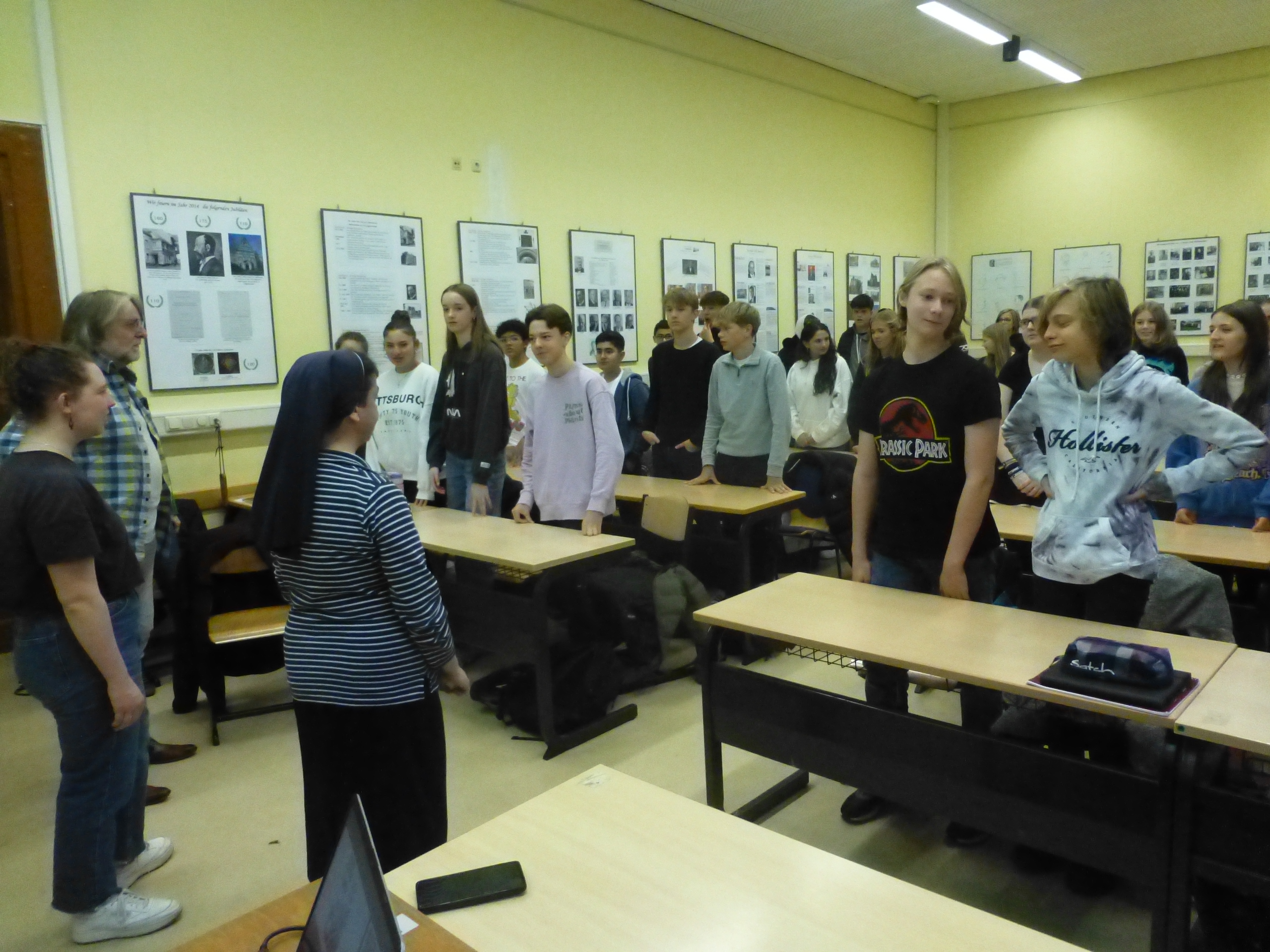 Je zwei Religionskurse der neunten und zehnten Klassen bekamen jetzt Besuch aus dem Libanon: Schwester Antoinette Assaf, begleitet von Meinrad Rupieper, unserem Kooperationspartner von der Abteilung Weltkirche des Bistums Essen, begrüßte die Schülerinnen und Schüler mit einem Energizer, bevor sie mit Kurzfilmen und Bildern die Krisen im Libanon und ihre eigene Arbeit in Beirut vorstellte. Der Libanon leidet unter einer Wirtschaftskrise, die 80 Prozent der Familien unter die Armutsgrenze gebracht hat, außerdem ist ein Drittel der Bevölkerung von psychischen Erkrankungen betroffen. Die Ordensfrau und Krankenschwester leitet das Community Health Care Center Saint-Antoine im Norden von Beirut. Hier gibt es medizinische Behandlungen, Vorsorgeuntersuchungen und Impfungen auch für Menschen ohne Krankenversicherung, aber ebenso Veranstaltungen zur Gesundheitserziehung.