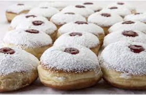 Entsprechend dem Ölwunder gehören zum Chanukkafest ölige Speisen, zum Beispiel Sufganiot, ein in Öl frittierter Pfannkuchen, der unserem Berliner ähnelt. Hier das Rezept: