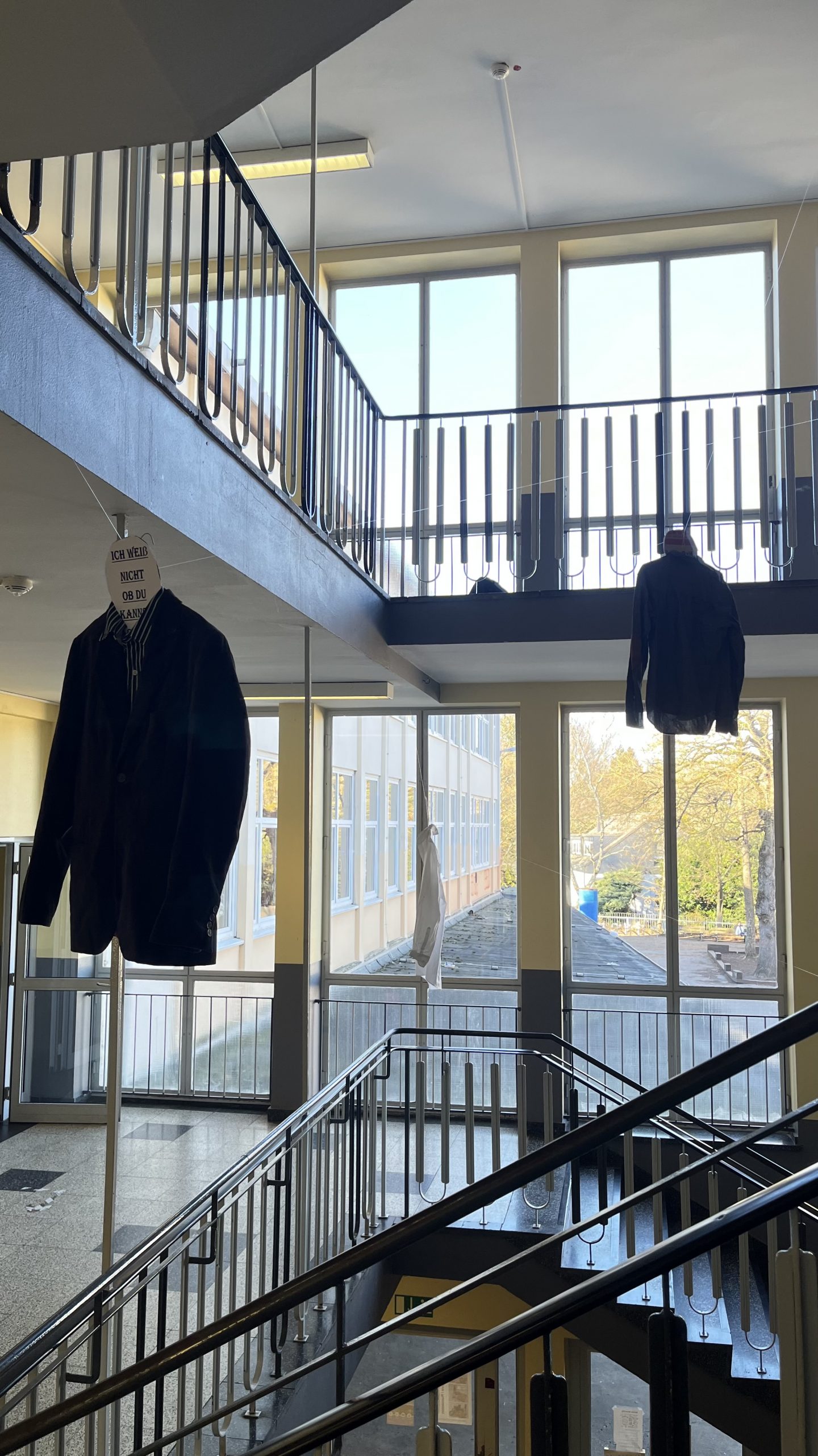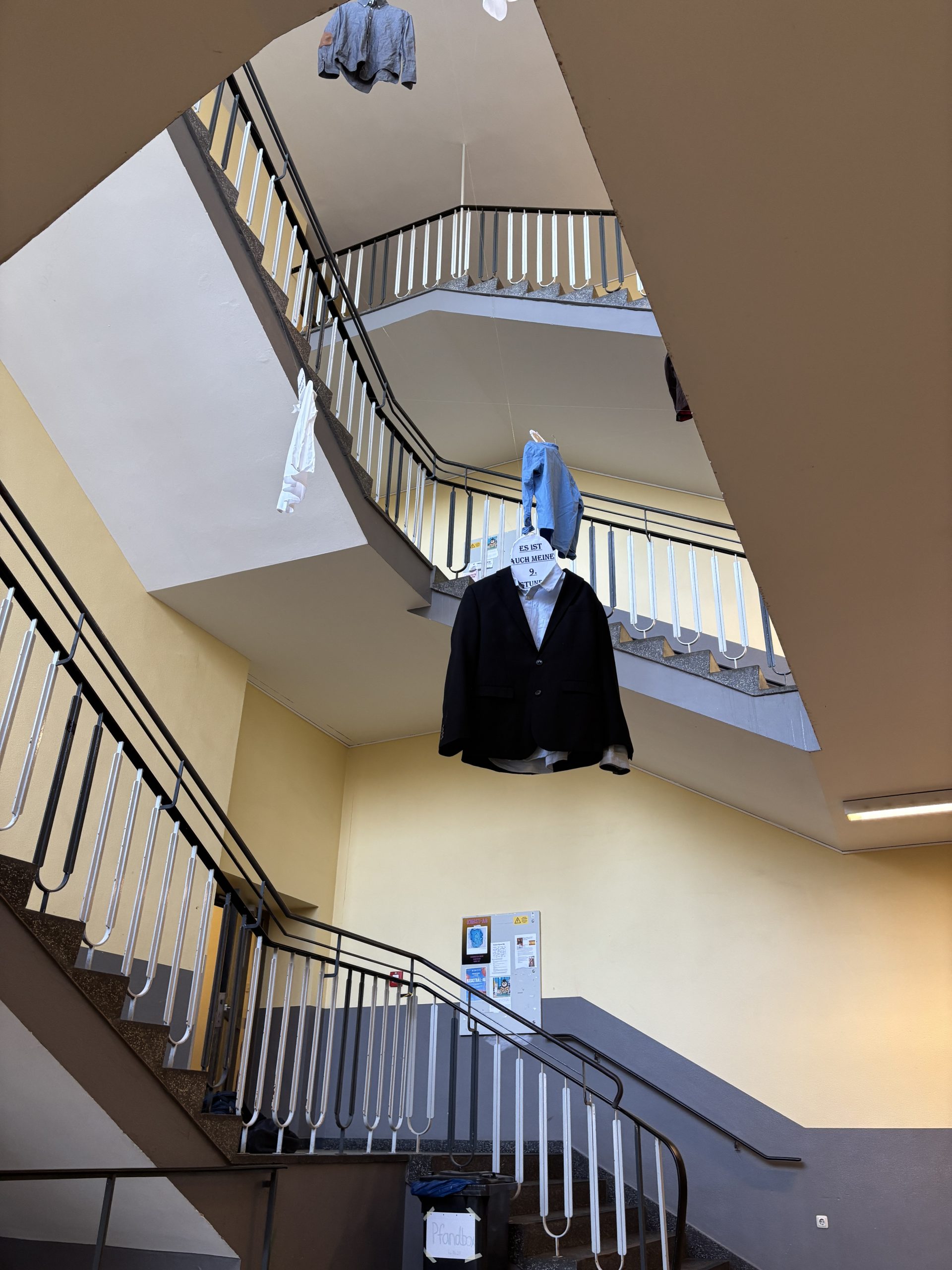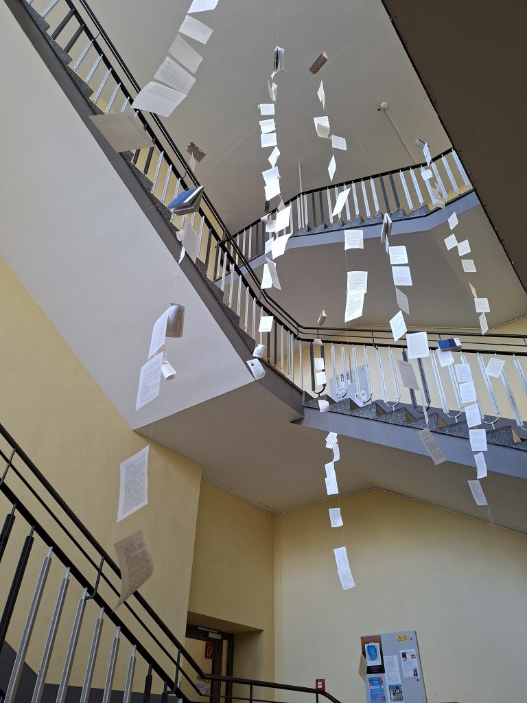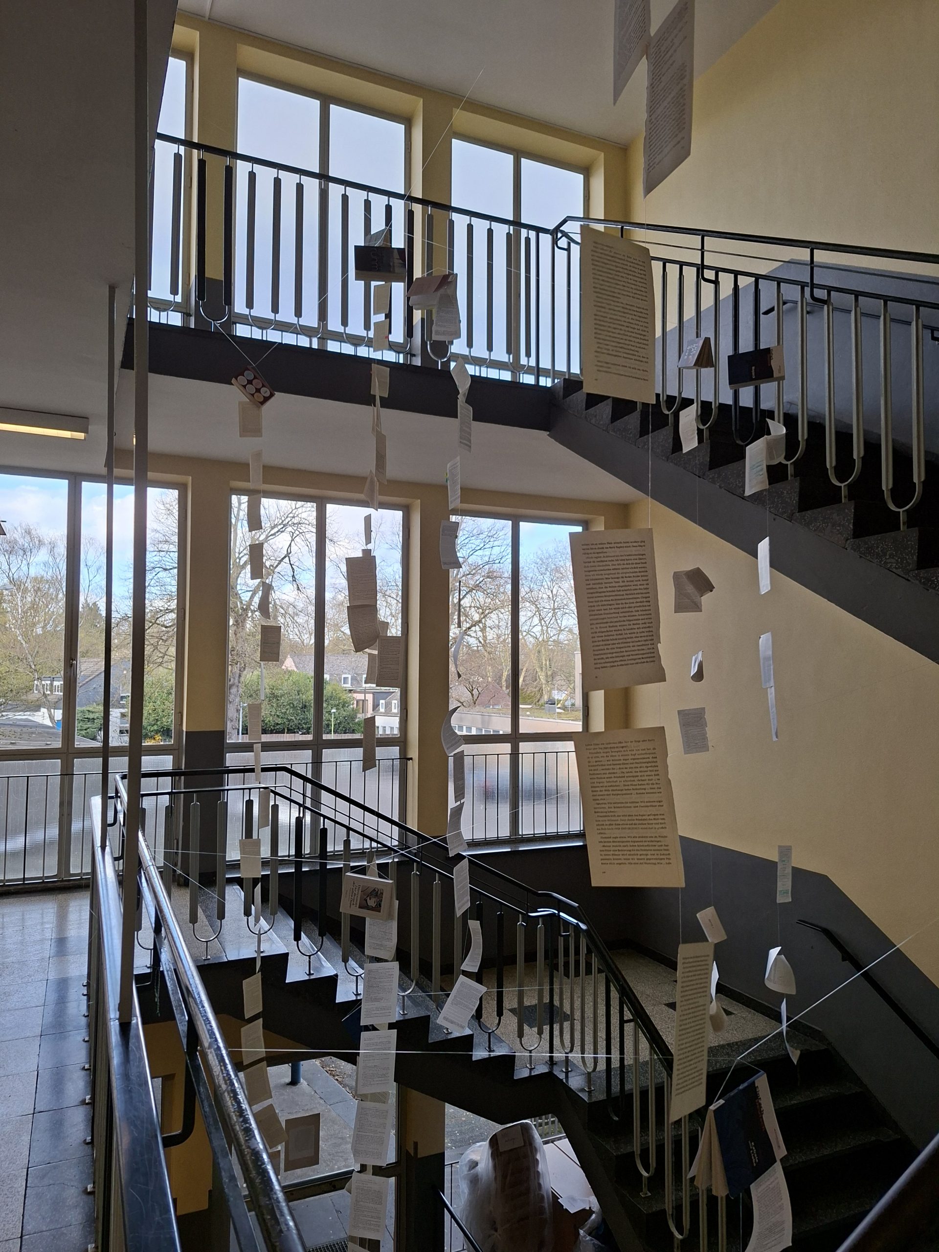 Ort des Geschehens war das große, alte Treppenhaus des CHG-Hauptgebäudes. Im Rahmen unseres Literaturprojektes haben wir als Kurs das Treppenhaus der Schule in einen interaktiven Erfahrungsraum verwandelt. Durch verschiedene Mobilés und Installationen wollten wir Literatur aus dem Klassenzimmer mitten in den Schulalltag bringen und die Mitschülerinnen und Mitschüler zum Nachdenken anregen.