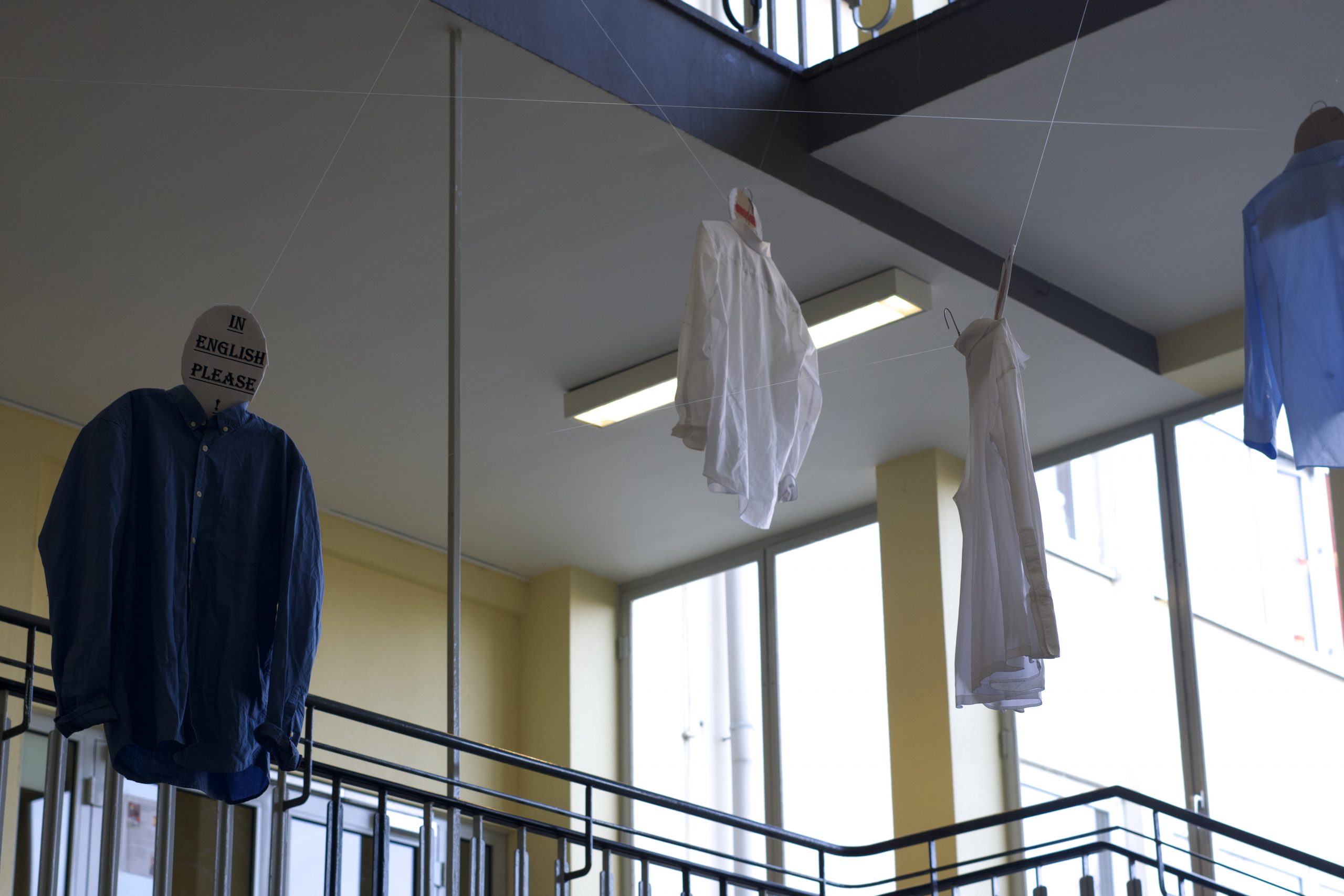 An Kleiderbügeln hängende Kleidungsstücke symbolisieren anonyme Autoritätspersonen. Bestückt mit typischen Lehrersprüchen wie „Glauben kannst du in der Kirche“, wird kritisch hinterfragt, wie Sprache Macht ausübt, Hierarchien festigt und den Dialog verhindert.