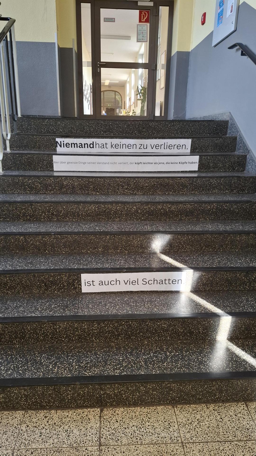 Beim Treppensteigen begegnen den Schülerinnen und Schülern Zitate großer Literaten (z. B. Goethe, Shakespeare und Dürrenmatt). Der physische Aufstieg symbolisiert dabei den geistigen Prozess: Erst wer oben ankommt und die Zitate im Vorbeigehen reflektiert, erhält ein Gesamtbild über das Wesen und die Auswirkungen von Macht in Form von Sprache.
