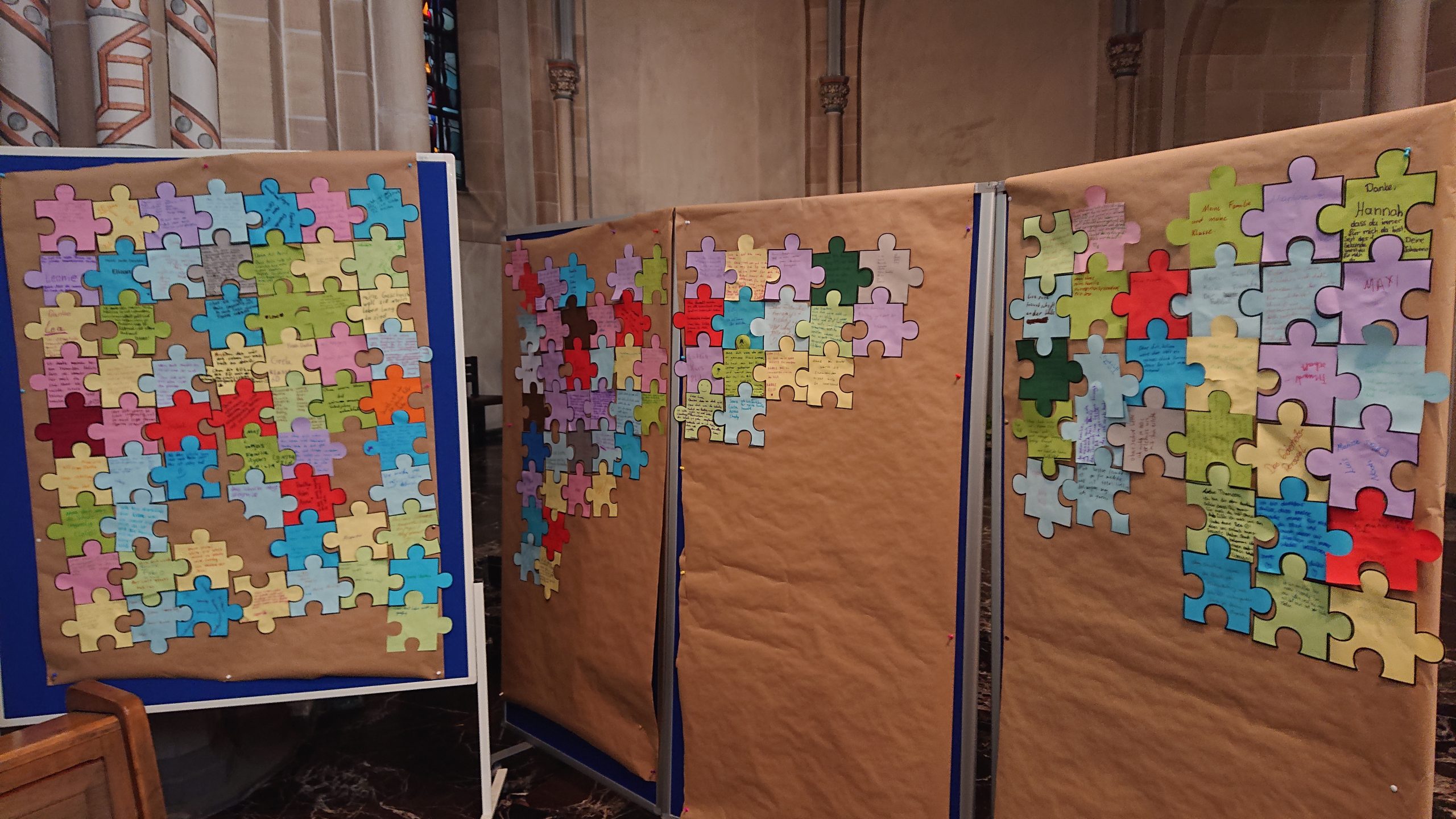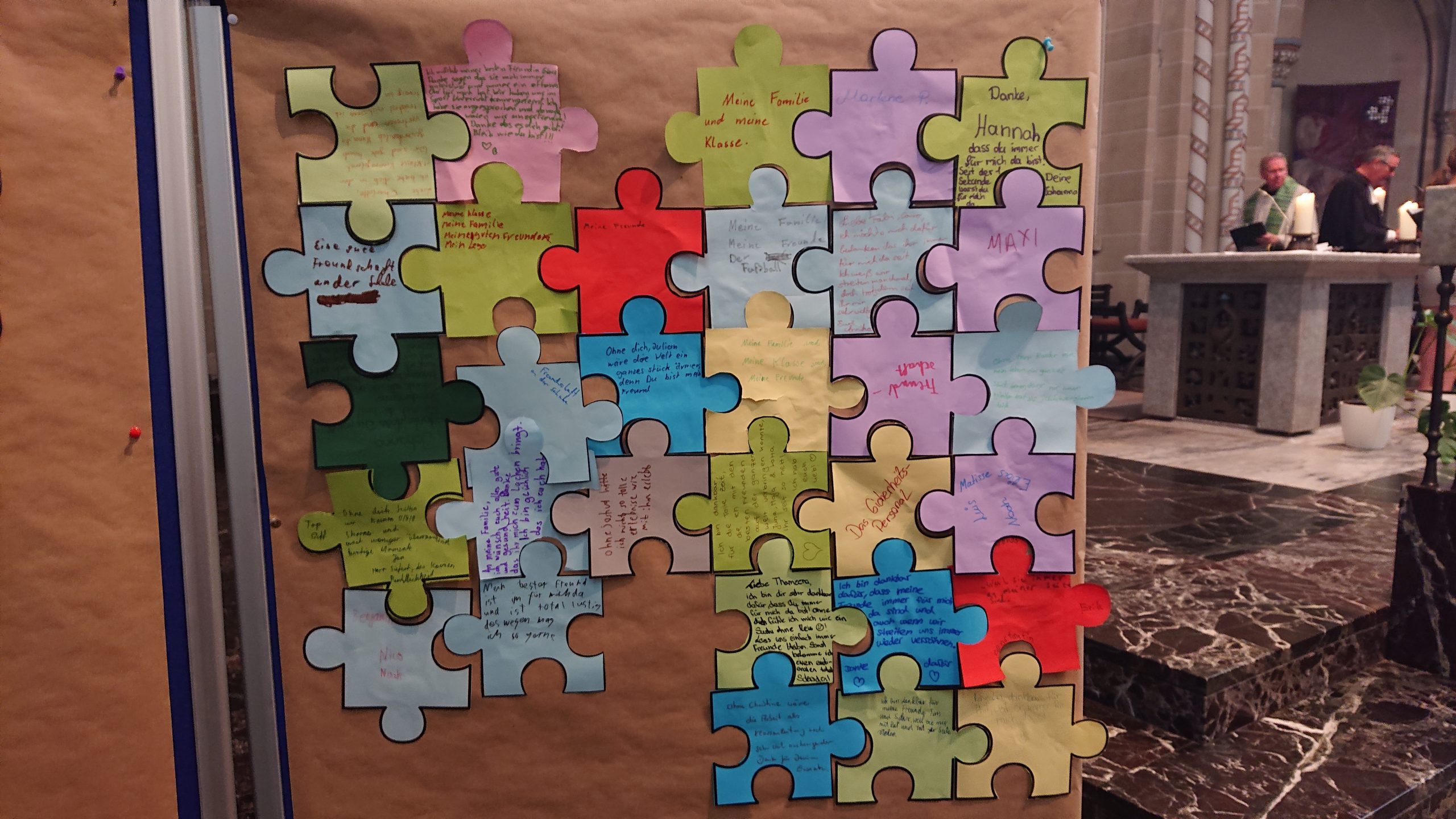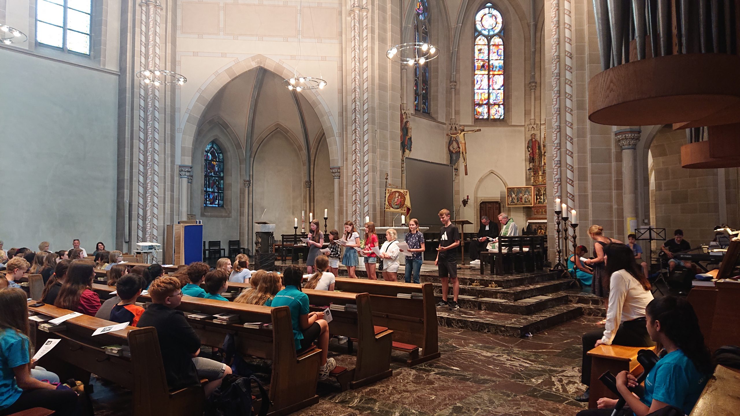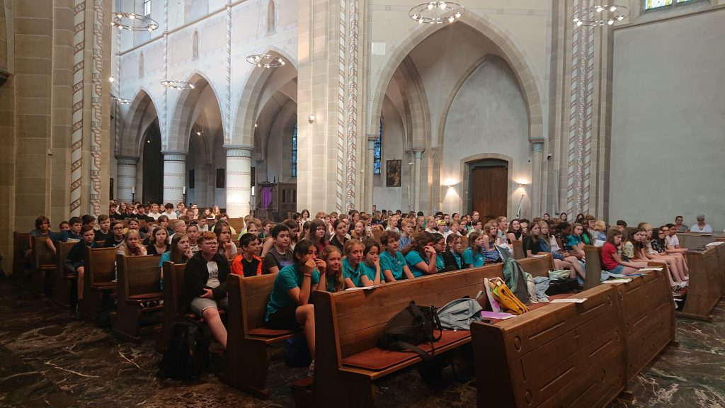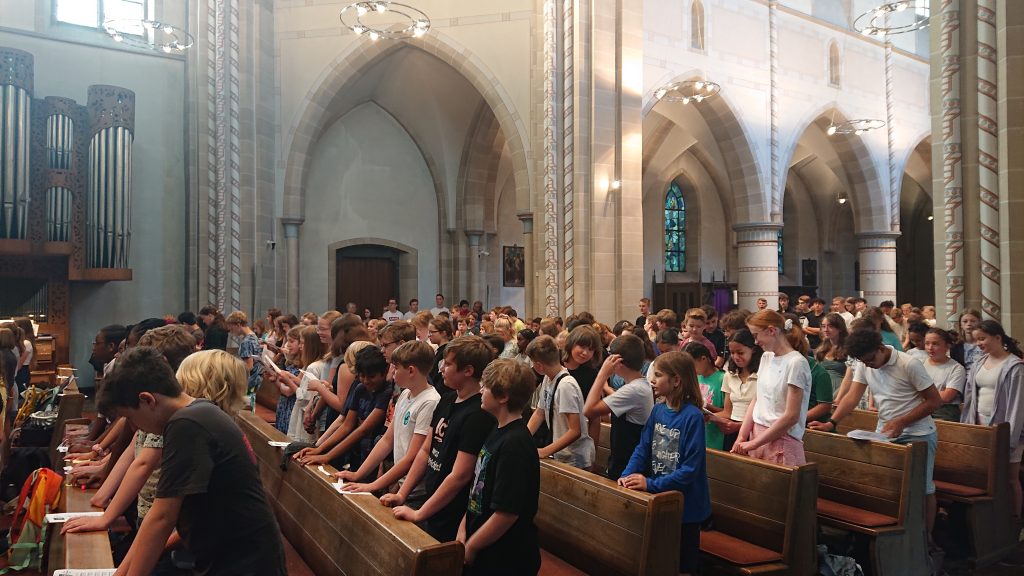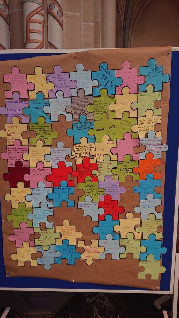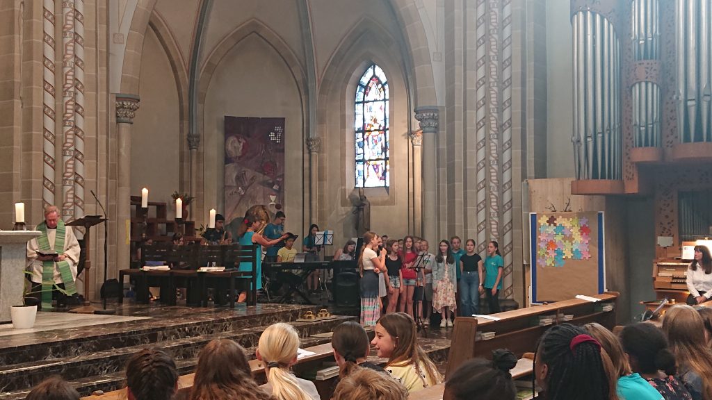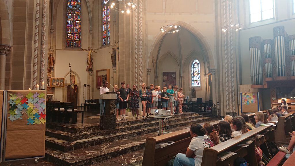 Unter diesem Thema stand der Schuljahresabschlussgottesdienst in St. Laurentius in diesem Jahr, wie immer geleitet von den Pfarren Dahlhoff und Dr. Geßmann und musikalisch gestaltet von Orchester und Unterstufenchor. Wie sähe unsere Schule aus ohne dich? Diese Frage hatten sich Schülerinnen und Schüler der Unter- und Mittelstufe im Religionsunterricht gestellt und beeindruckende Antworten gefunden: „Du hilfst mir immer, wenn ich Hilfe brauche!“ war zu hören, „Ich fühle mich prima in deiner Nähe.“, „Du bist mein Kleeblatt und mein Stern.“, „Vielen Dank, dass du immer da bist!“, „Ohne dich hätte ich in den Pausen nichts zu tun.“, „Du machst mir Mut.“, „Ich kann dir vertrauen und du kannst Sachen für dich behalten.“, „Sie haben mir selbstständiges Denken beigebracht.“ und „Ihr habt zu mir gehalten, als ich geärgert wurde.“ Sehr viel Lob und Dankbarkeit wurden vorgetragen. Danach bekamen alle ein buntes Puzzleteil aus Papier, um selbst aufzuschreiben, ohne wen sie sich das Leben am Carl-Humann-Gymnasium nicht vorstellen können und warum. Alle Teile wurden anschließend zu einem riesigen Puzzle-Poster im Altarraum zusammengefügt, das jetzt an der Schule zu sehen ist und uns alle daran erinnert: Ohne dich … wäre die Welt ein ganzes Stück ärmer.