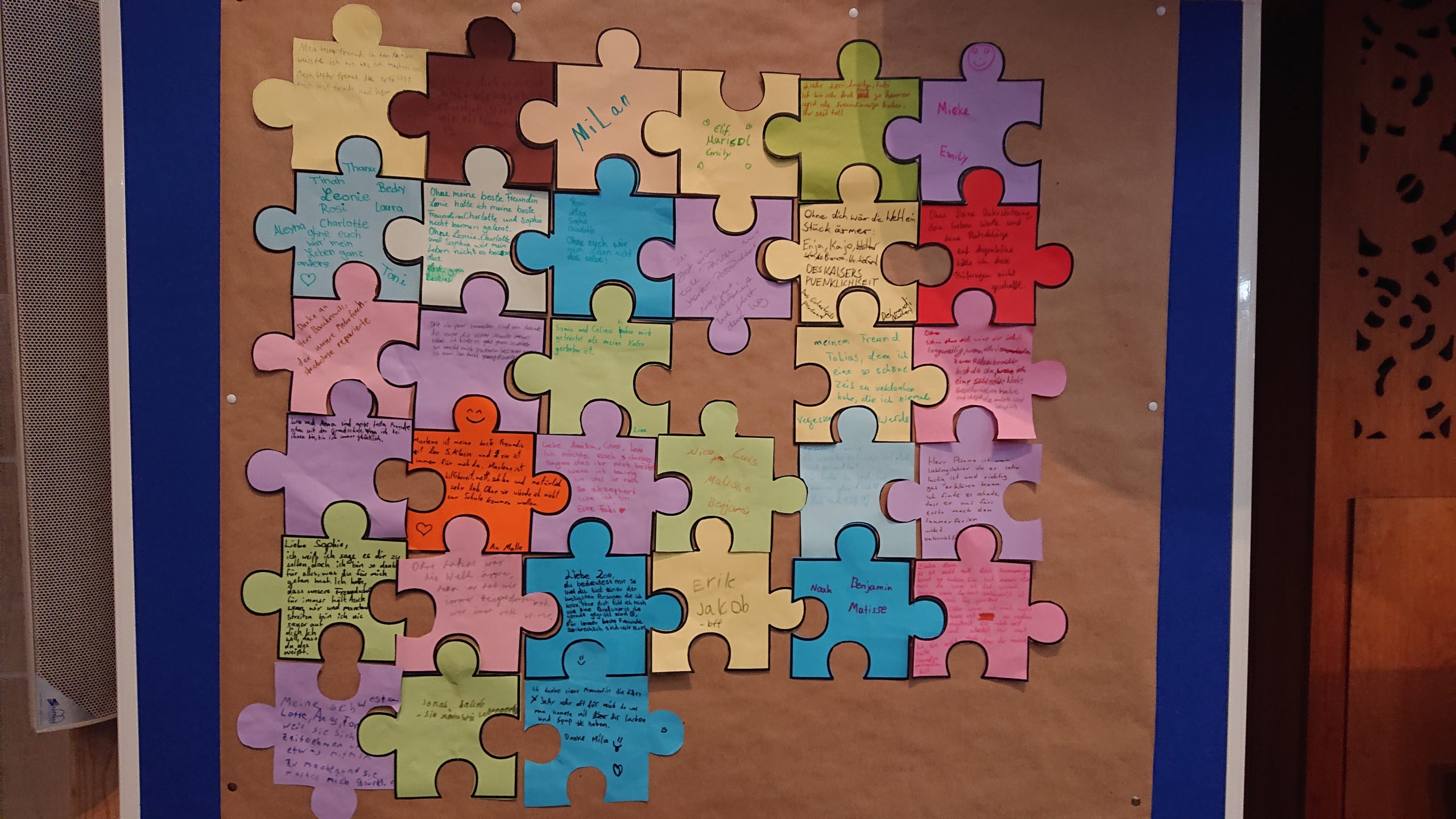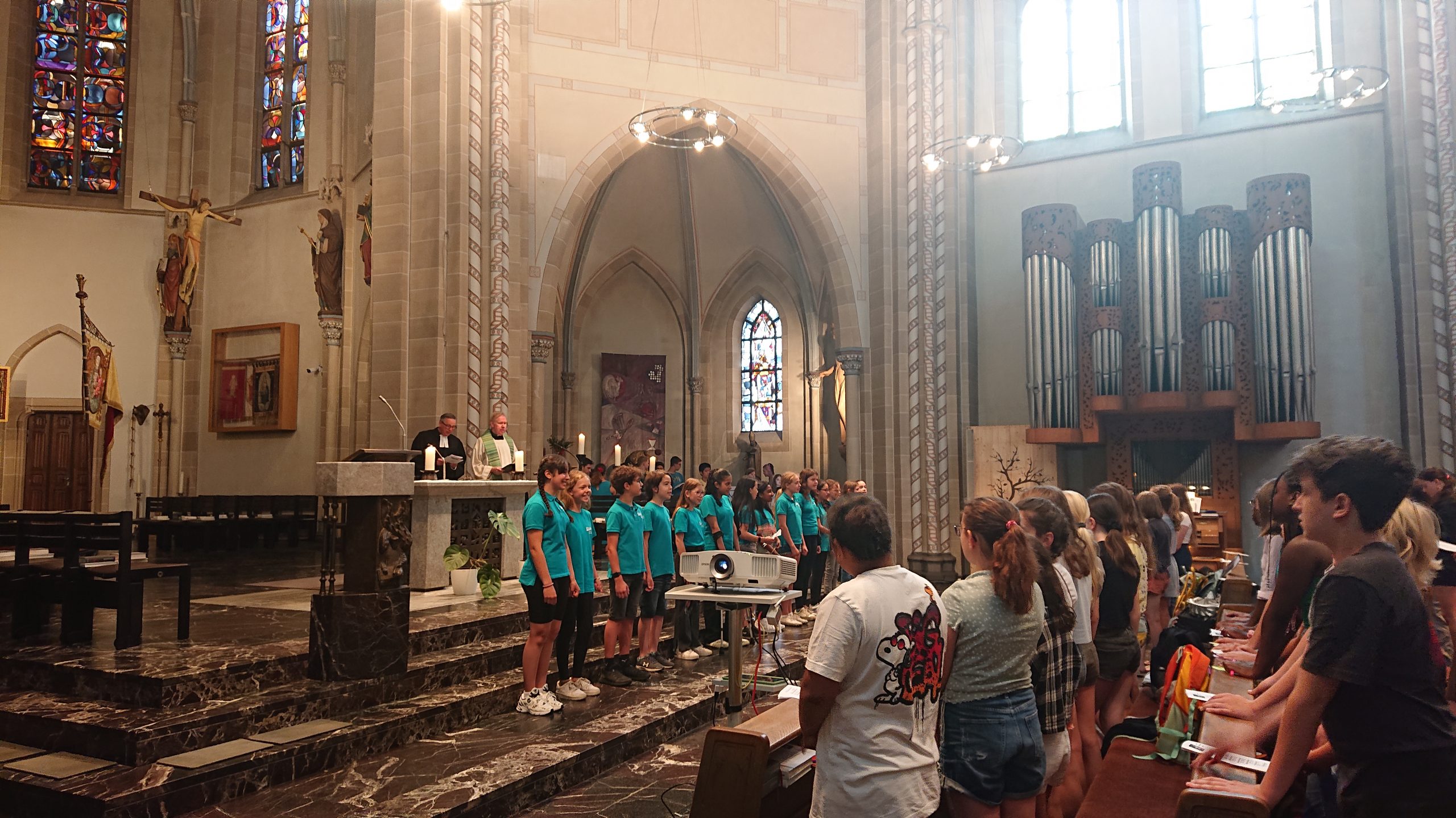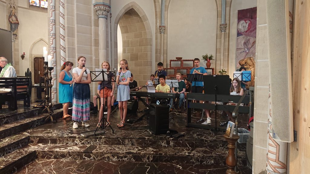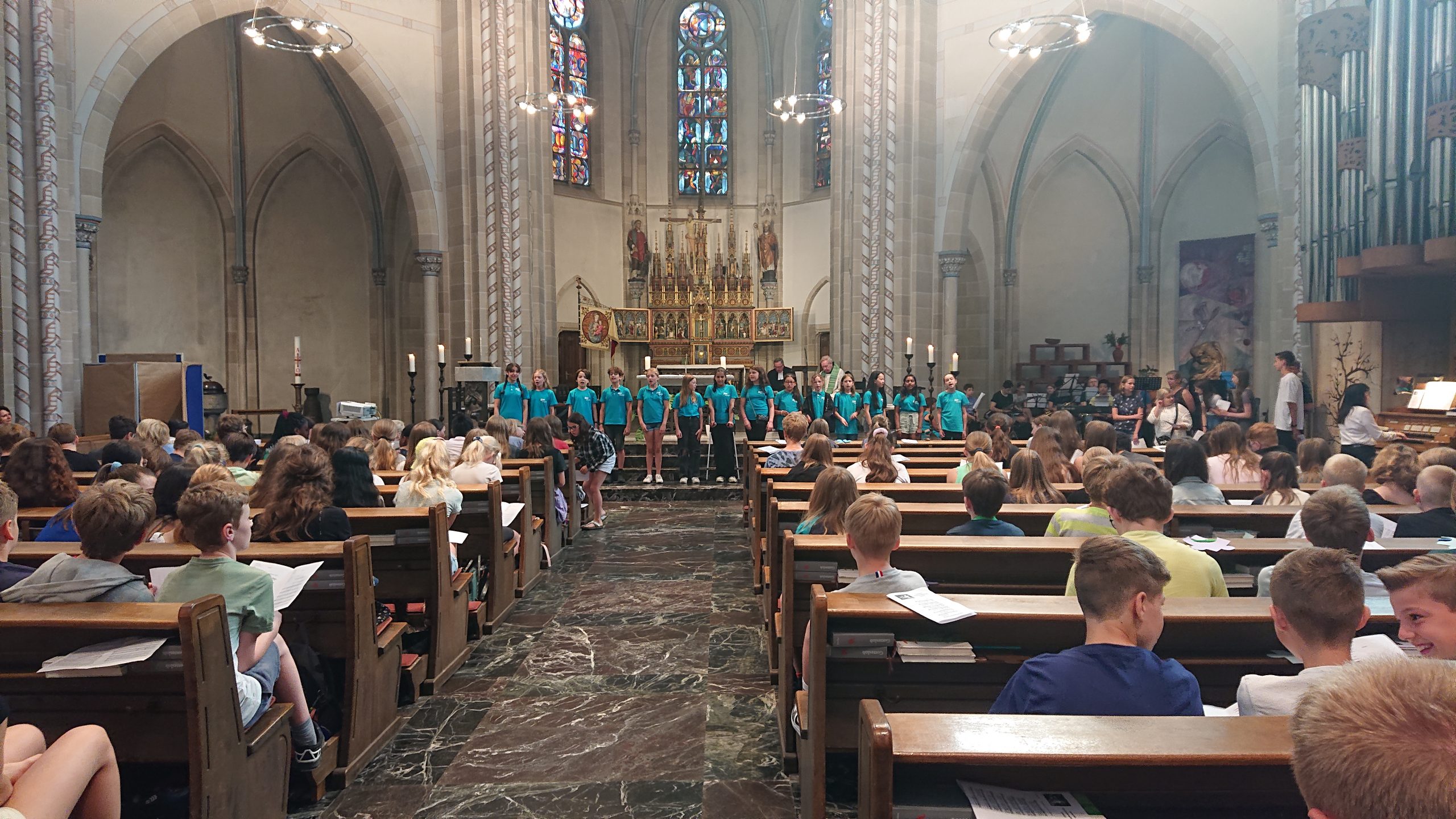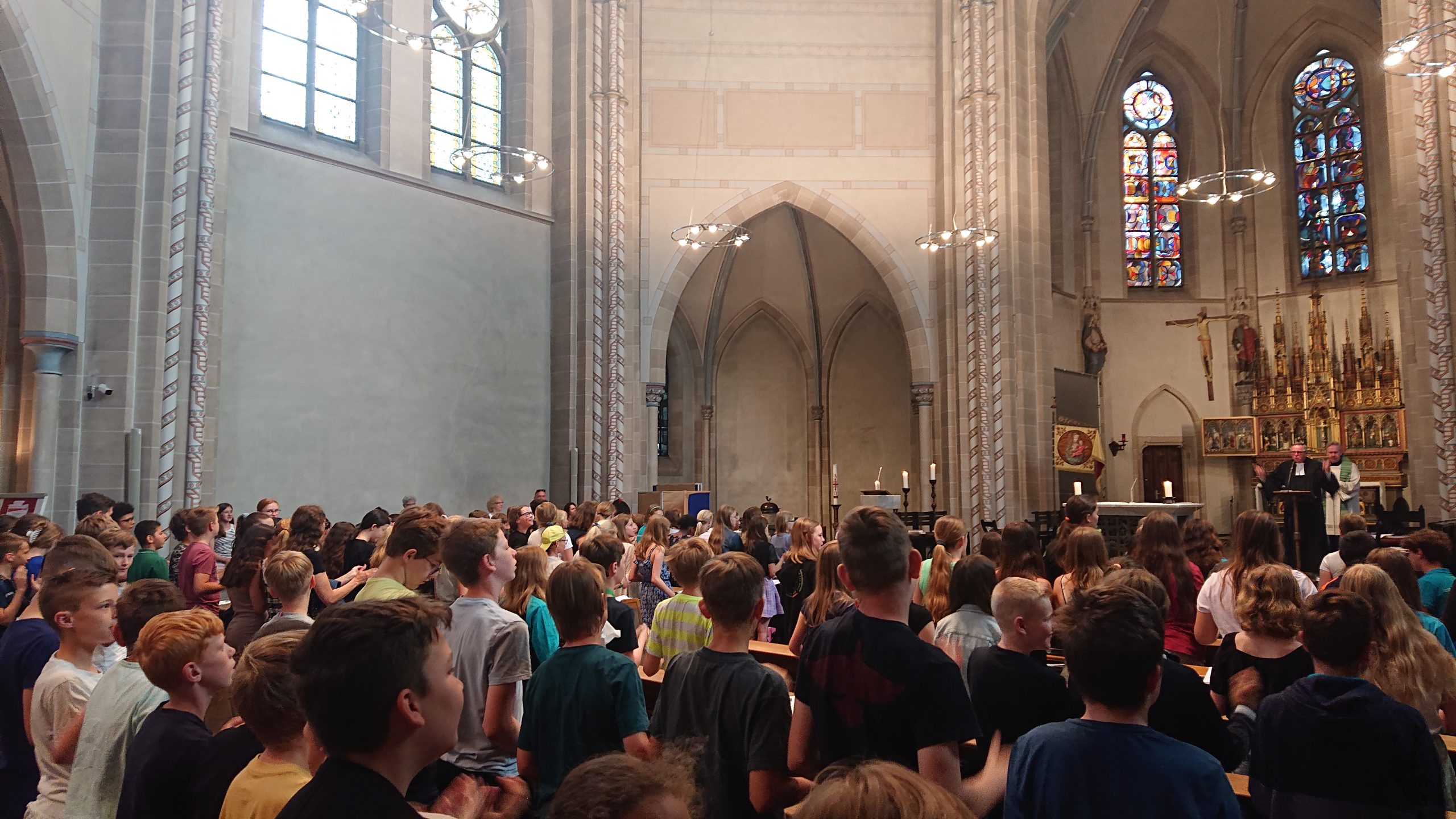 Unter diesem Thema stand der Schuljahresabschlussgottesdienst in St. Laurentius in diesem Jahr, wie immer geleitet von den Pfarren Dahlhoff und Dr. Geßmann und musikalisch gestaltet von Orchester und Unterstufenchor. Wie sähe unsere Schule aus ohne dich? Diese Frage hatten sich Schülerinnen und Schüler der Unter- und Mittelstufe im Religionsunterricht gestellt und beeindruckende Antworten gefunden: „Du hilfst mir immer, wenn ich Hilfe brauche!“ war zu hören, „Ich fühle mich prima in deiner Nähe.“, „Du bist mein Kleeblatt und mein Stern.“, „Vielen Dank, dass du immer da bist!“, „Ohne dich hätte ich in den Pausen nichts zu tun.“, „Du machst mir Mut.“, „Ich kann dir vertrauen und du kannst Sachen für dich behalten.“, „Sie haben mir selbstständiges Denken beigebracht.“ und „Ihr habt zu mir gehalten, als ich geärgert wurde.“ Sehr viel Lob und Dankbarkeit wurden vorgetragen. Danach bekamen alle ein buntes Puzzleteil aus Papier, um selbst aufzuschreiben, ohne wen sie sich das Leben am Carl-Humann-Gymnasium nicht vorstellen können und warum. Alle Teile wurden anschließend zu einem riesigen Puzzle-Poster im Altarraum zusammengefügt, das jetzt an der Schule zu sehen ist und uns alle daran erinnert: Ohne dich … wäre die Welt ein ganzes Stück ärmer.