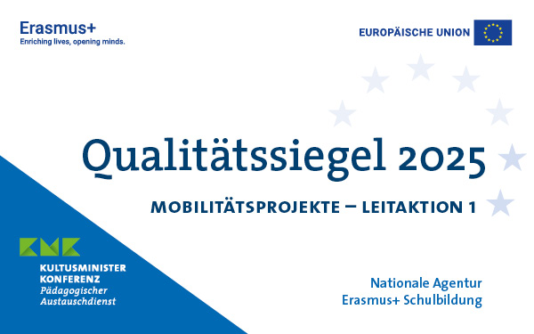 Bereits 2024 wurden wir von der Kultusministerkonferenz und dem Pädagogischen Austauschdienst (PAD) für die Qualität unserer ERASMUS+-Arbeit ausgezeichnet  . Dass wir diese Anerkennung nun erneut erhalten haben, bestätigt die nachhaltige und kontinuierliche Entwicklung unseres internationalen Programms.