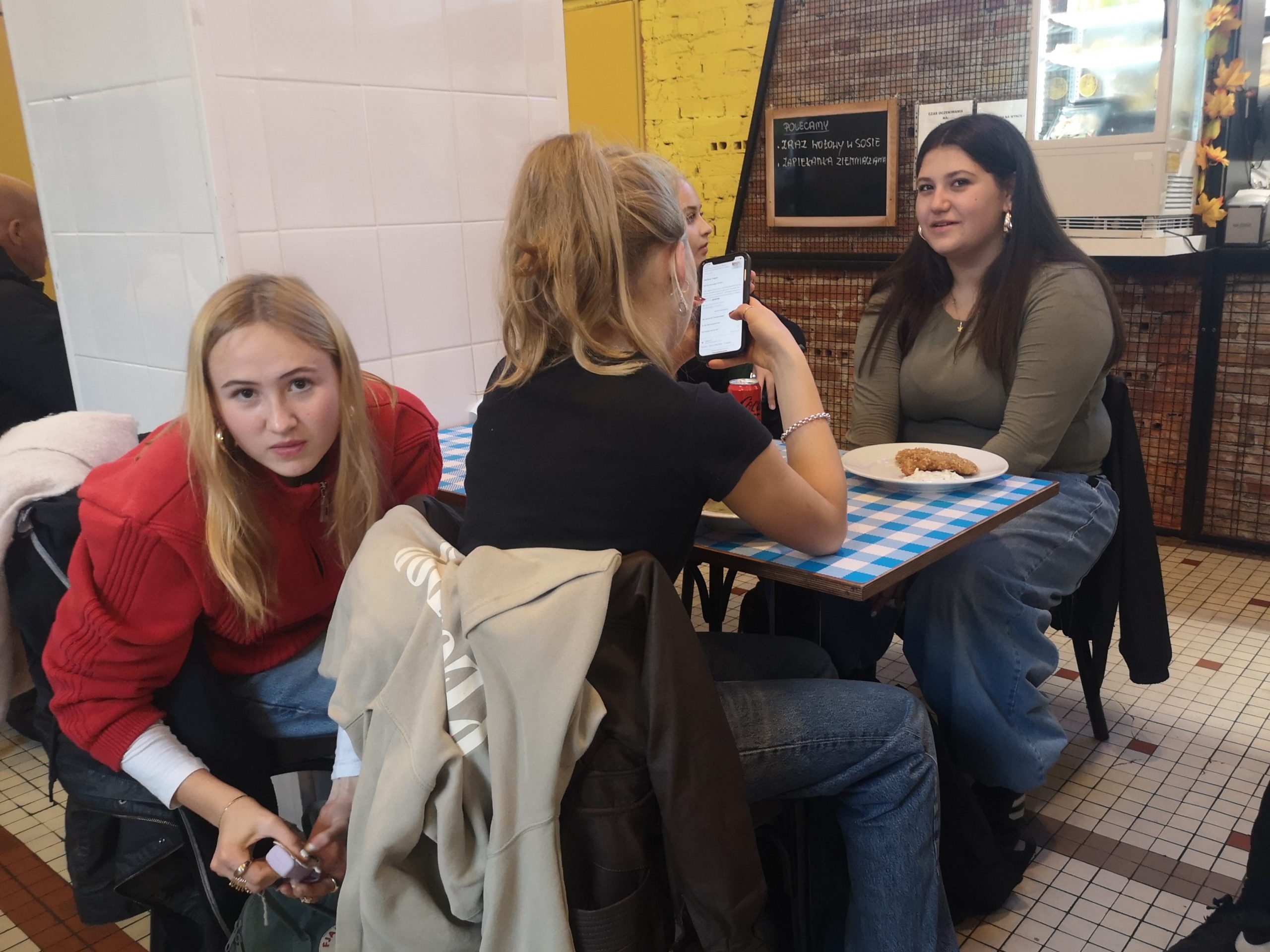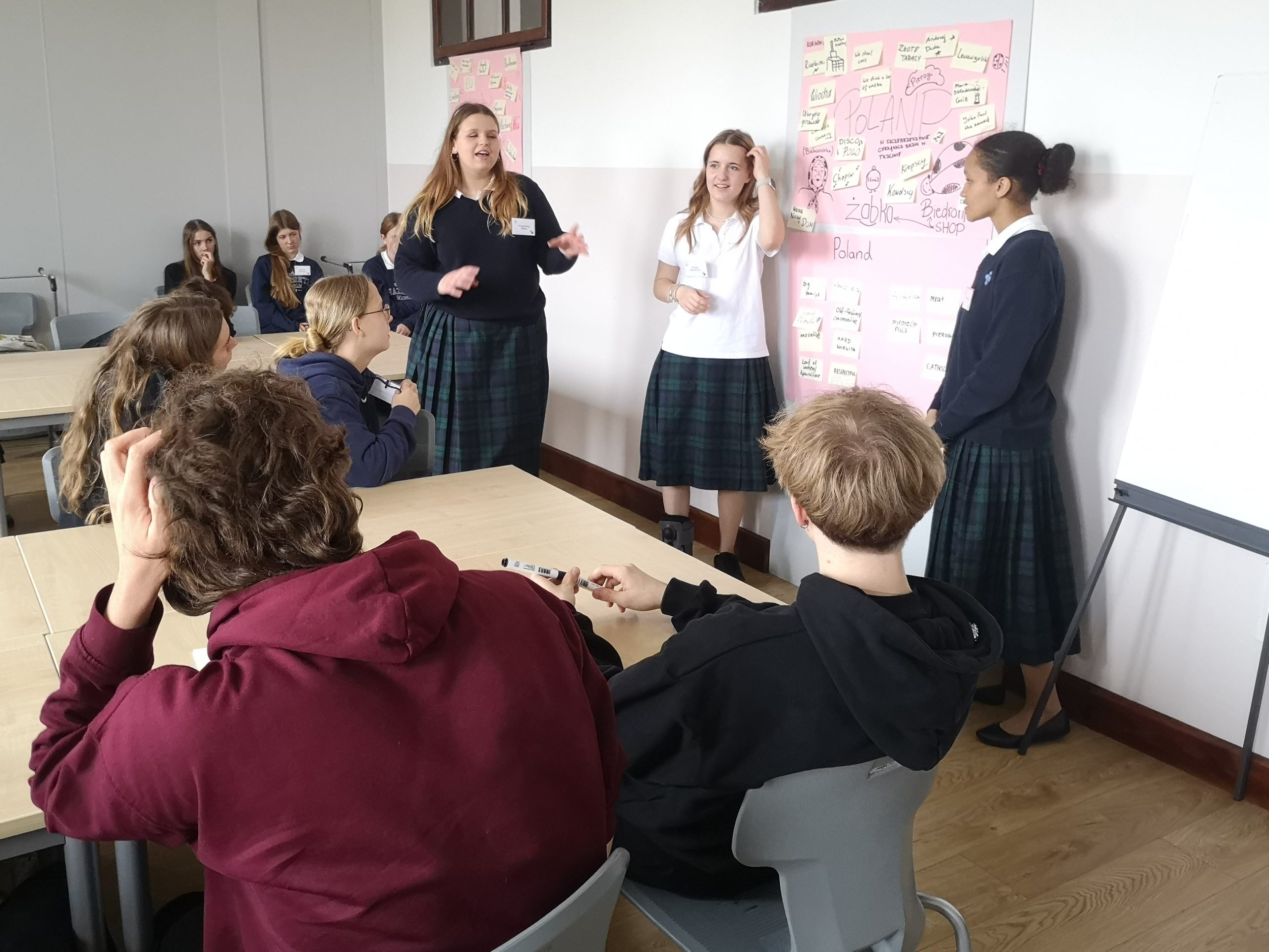 Am Montag hoben wir optimistisch, aber viel zu früh vom Düsseldorfer Flughafen ab Richtung Warschau Chopin, wo wir von unserer Gastschule persönlich abgeholt und zu Schule gefahren wurden. Beim anschließenden Welcome-meeting hielten Fabio und Mandana souverän ihre im Vorfeld gut vorbereiteten Präsentationen, in denen sie den Warschauer Schülerinnen Wissenswertes über unsere Heimatstadt und wichtige Trends deutscher Jugendlicher gekonnt näher brachten – natürlich auf Englisch. Obwohl sich nach dem Mittagessen das Schlafdefizit in unserer Gruppe zunehmend bemerkbar machte, setzten wir uns zusammen mit unseren Gastgeben mit polnischen und deutschen Stereotypen auseinander, der Funktion von Vorurteilen und zogen Schlussfolgerung zu unserem Umgang mit ihnen.