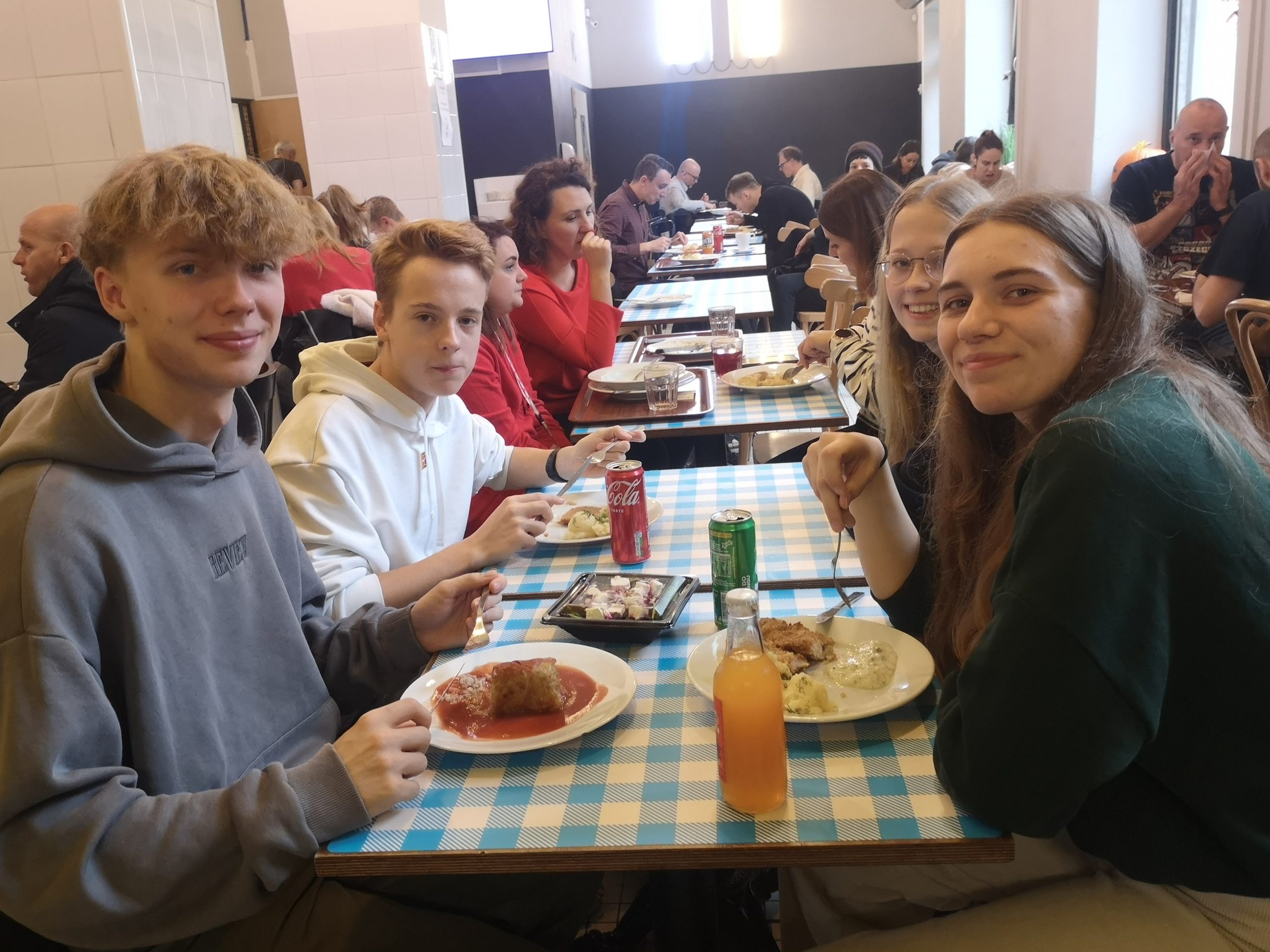 Nachmittags machten wir uns auf dem Weg zum wohl imposantesten Gebäude Warschaus, dem Kulturpalast – trotz des schlechten Wetters sicherlich nicht nur für Charlotte eine bleibende Erinnerung. Den langen Tag rundeten wir zusammen mit unseren Gastschülerinnen beim Essen typischer polnischer Speisen wie Piroggen und Bigos ab. Ebenso lecker wie reichhaltig kam Merle auf die tolle Idee die ebenso üppigen Überreste einpacken zu lassen und noch Bedürftigen zu spenden. Gesagt, getan!