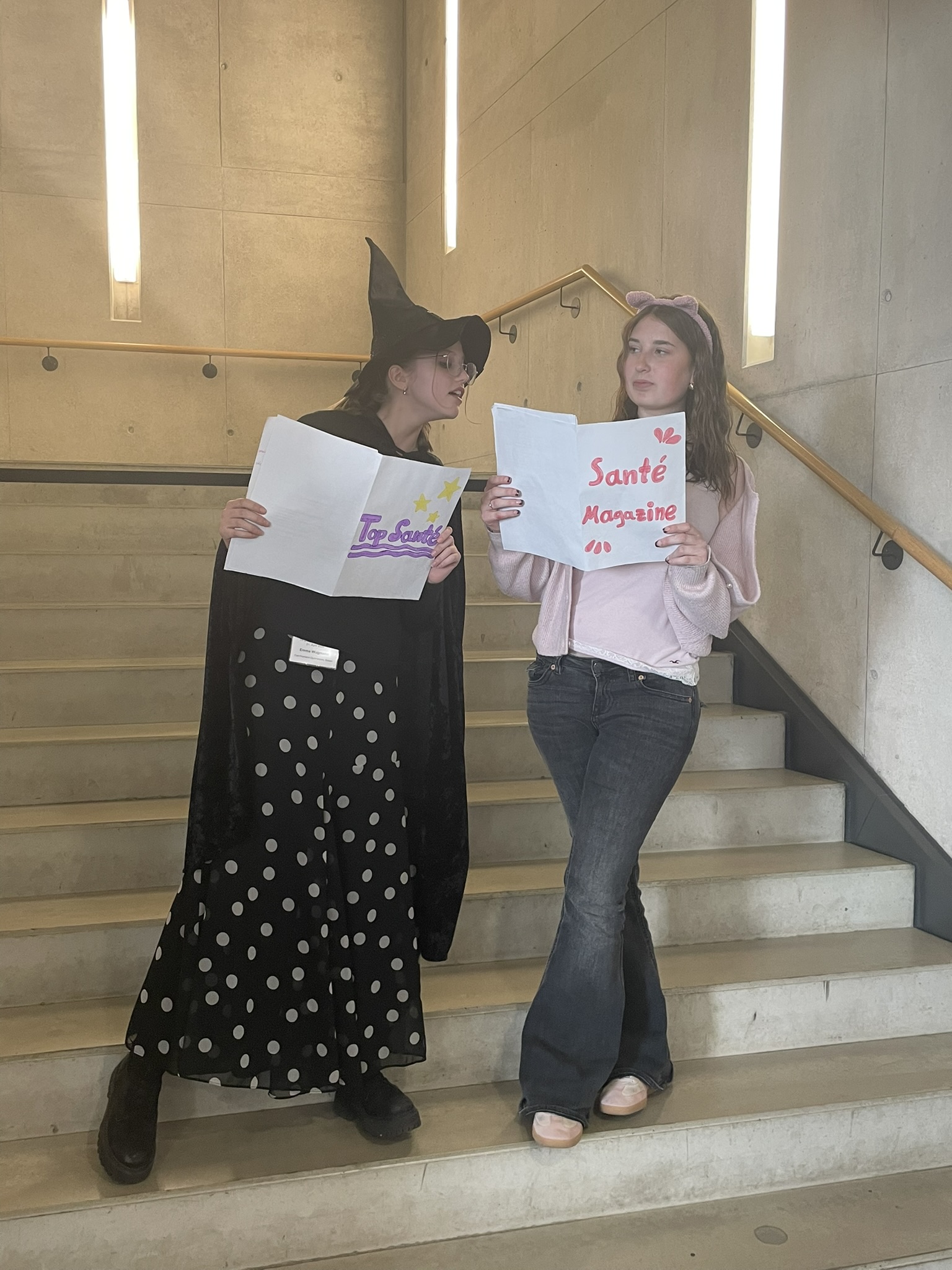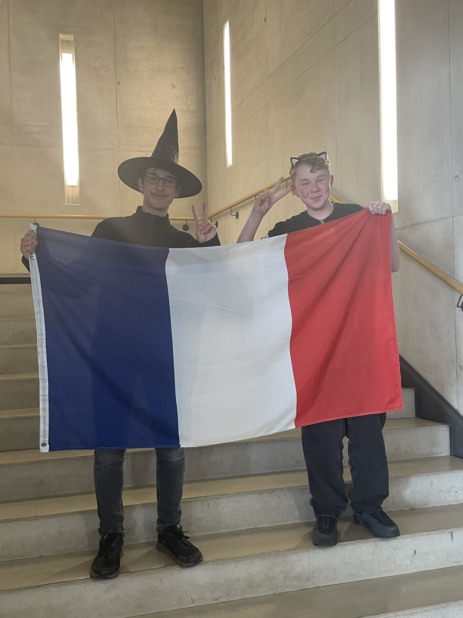 In 2er Teams übten die Schüler und Schülerinnen einen französischen Dialog weitgehend frei und betont vorzulesen. Auch setzten sie dabei ausdrucksstark ihre Gestik und Mimik ein und machten ihren Sketch durch eigene Kostüme noch lebendiger.